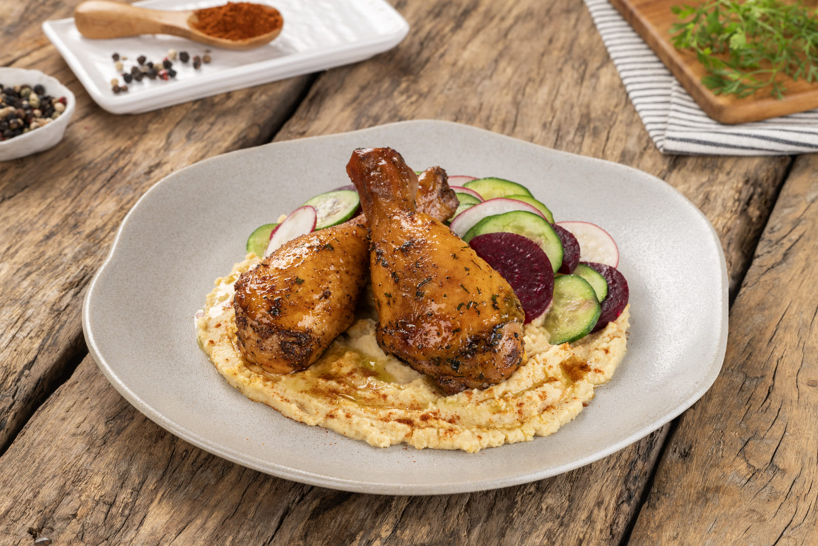Sirva las piezas de pollo sobre el puré de garbanzos y espolvoree pimentón.