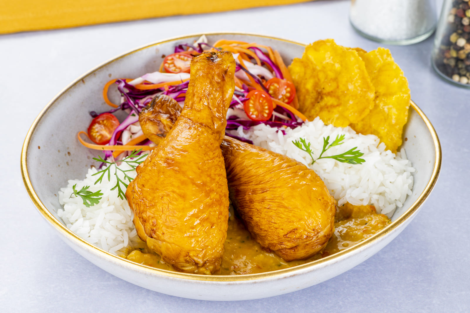 Sirva acompañado de ensalada de col, arroz y tajadas.